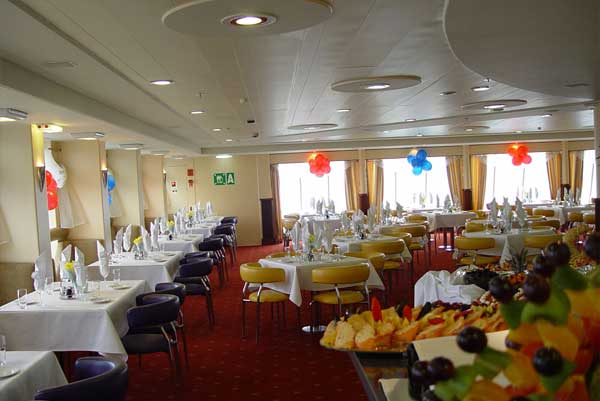 Do dyspozycji pasażerów są sklepy, bary, restauracje, kawiarnia, sala konferencyjna oraz kino oraz kabiny 2, 3 i 4 osobowe.